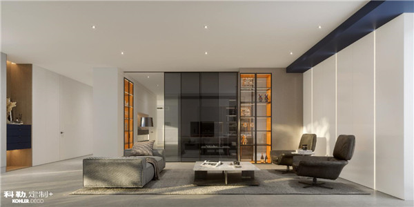 在國際范的現代感背后,科勒廚房,全屋定制至臻系列將流暢動線和通透格局相交織。吊趟式的三連動玻璃隔斷門讓空間穿透性更強、環境更酷,同時避免了地軌藏污納垢。